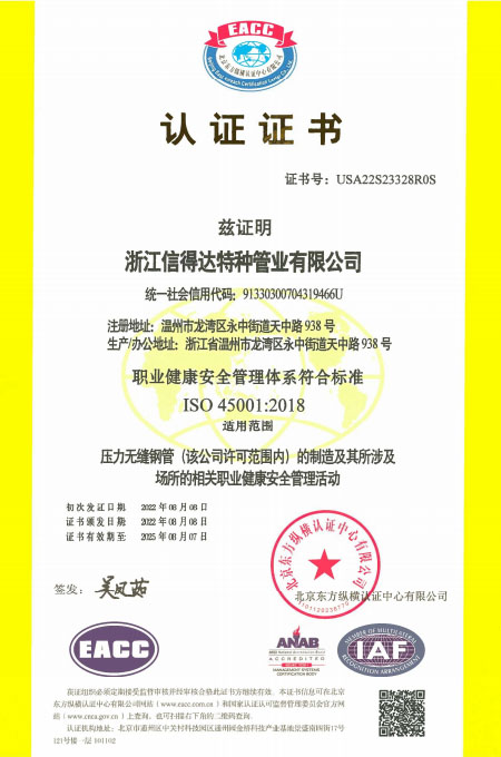 公司已全面通過了ISO9001:2008質(zhì)量管理體系認證、14000環(huán)境管理體系認證、18000職業(yè)健康管理體系認證、國家質(zhì)量檢驗檢疫總局A2-B類壓力管道元件制造許可、 歐盟PED認證及德國AD-2000產(chǎn)品強制認證、美國ASME材料產(chǎn)品認證、信得達擁有1條穿孔生產(chǎn)線,10條冷拔生產(chǎn)線8條冷軋?zhí)胤N無縫鋼管生產(chǎn)線。